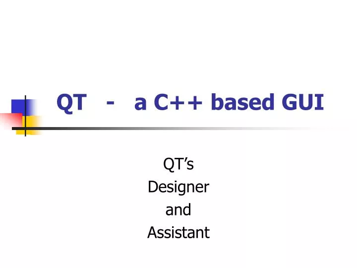 Introduction to GUI development using Qt Qt is a cross-platform development framework written in C++ Build GUI using QtDesigner 1/3 Qt Designer uses XML .ui files to store designs and does not generate any code itself ... Fetch Full Source